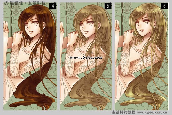 7、开始给头发上色:这张画是送给小白老师的贺图,小白的头发是黄色的,所以我把棕色用“色相/饱和度”和“色彩平衡”调到土黄色。