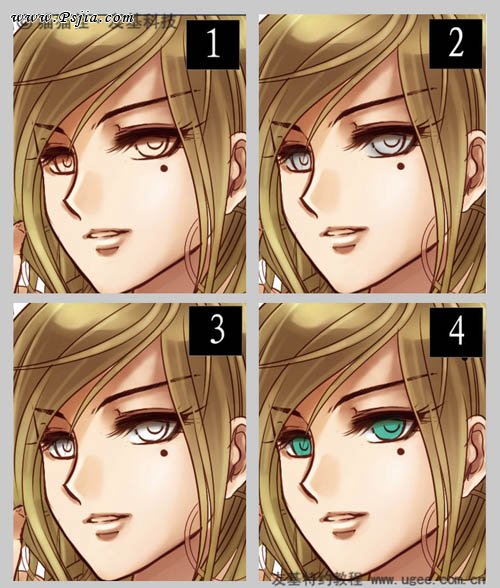 7、开始给头发上色:这张画是送给小白老师的贺图,小白的头发是黄色的,所以我把棕色用色相/饱和度和色彩平衡调到土黄色。 8、眼睛:眼睛是一个至