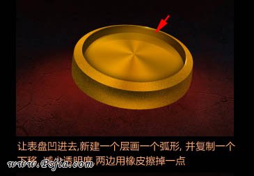 5、让表盘凹进去,新建一个图层画一个弧形,并复制一个下移,减少透明度,两边用橡皮擦掉一点。
