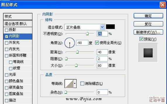 3、先不要取消选取,双击苹果图层,调出图层样式,选择内阴影,如下设置。