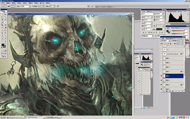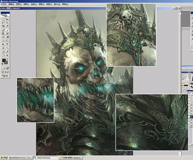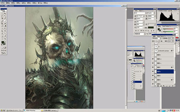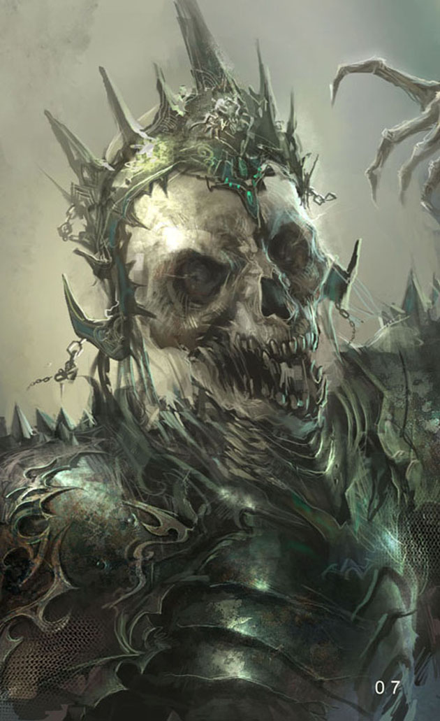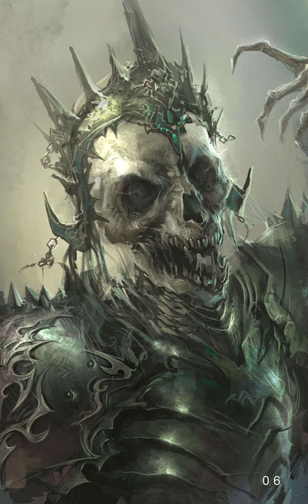 考虑到角色的身份,为他加了一顶代表身份的王冠,当然在造型上也是往死亡,邪恶的感觉靠(图06)这个时候差不多有60%的完成度了,此时可暂停下来,看一看大关系及角色的融合度.