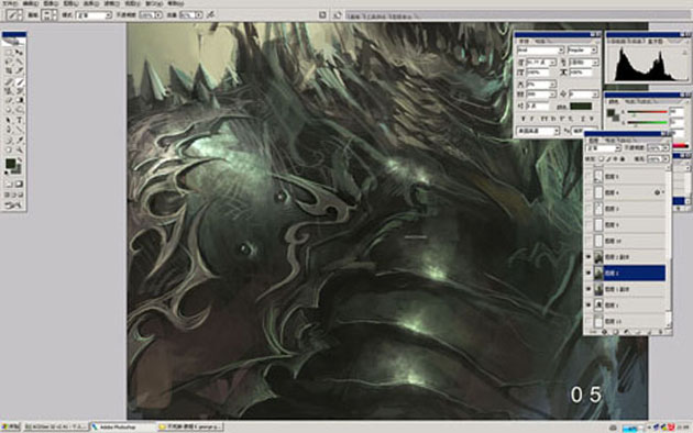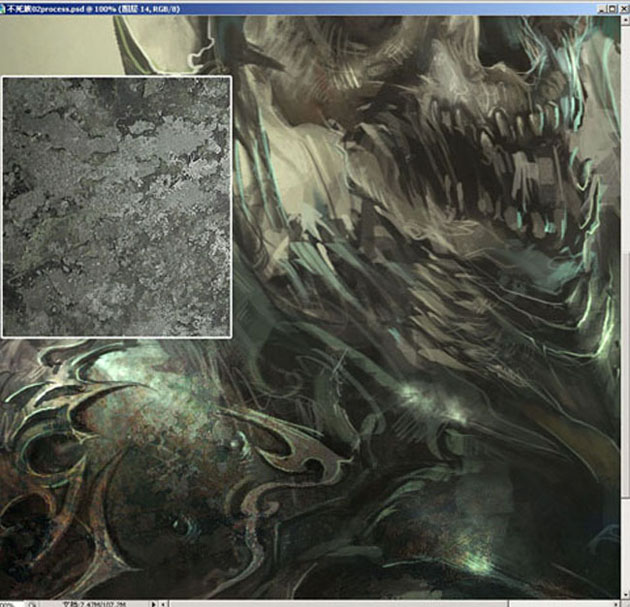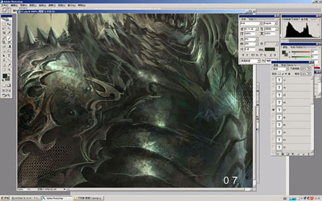 在此基础上进一步完善其盔甲的质感,选择一张真实铁锈的贴图,做成图章工具,用叠加模式加以融合(图07),从另一方面看,沉重,精致,带有历史苍桑感的视觉效果也符合这个不死族首领的内在气质