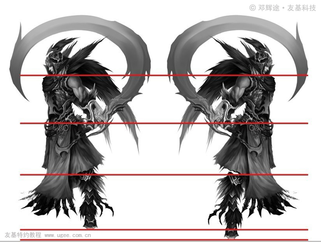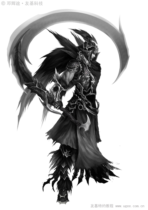 20.人物的盔甲装备都大致完成后,就可以开始绘制人物的兵器“死神镰刀”了。我在刀的脊梁位置加了一点类似脊椎骨形态的装饰物,加强了“死神镰刀”的感觉,再通过拉开明暗质感,使得武器更加厚重、锋利。到此,这张图的单色稿就完成了。