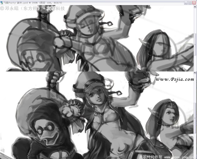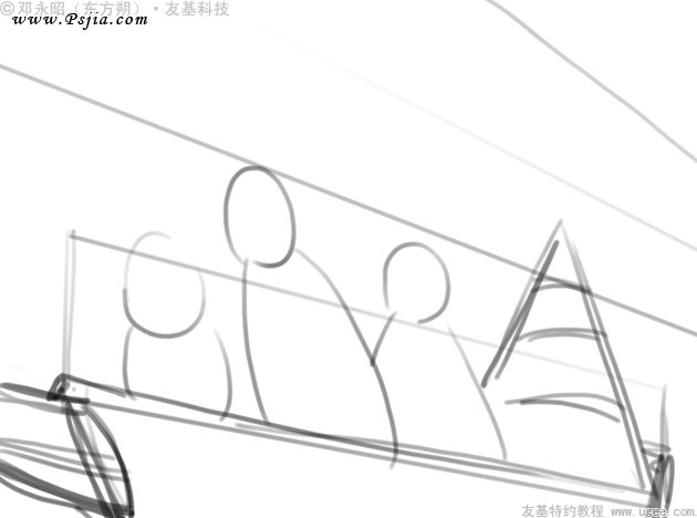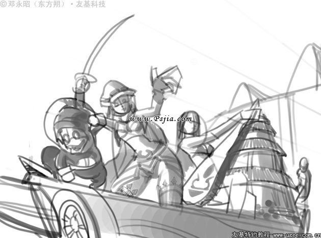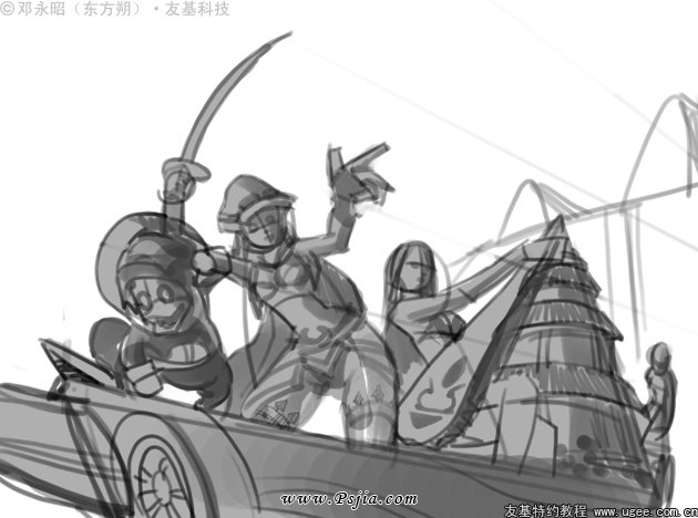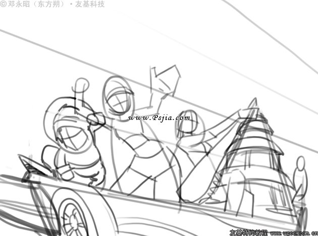 2.继续完善草图,简单画出人物的基本动作和方位,定好前后的透视关系(略带仰视的构图)。