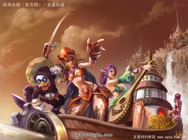 今天拿来做教程的是一张带有海盗风格的插图,在变幻莫测的大海上,女海盗们驾着飞船徜徉,追寻着自己心中的宝藏……
