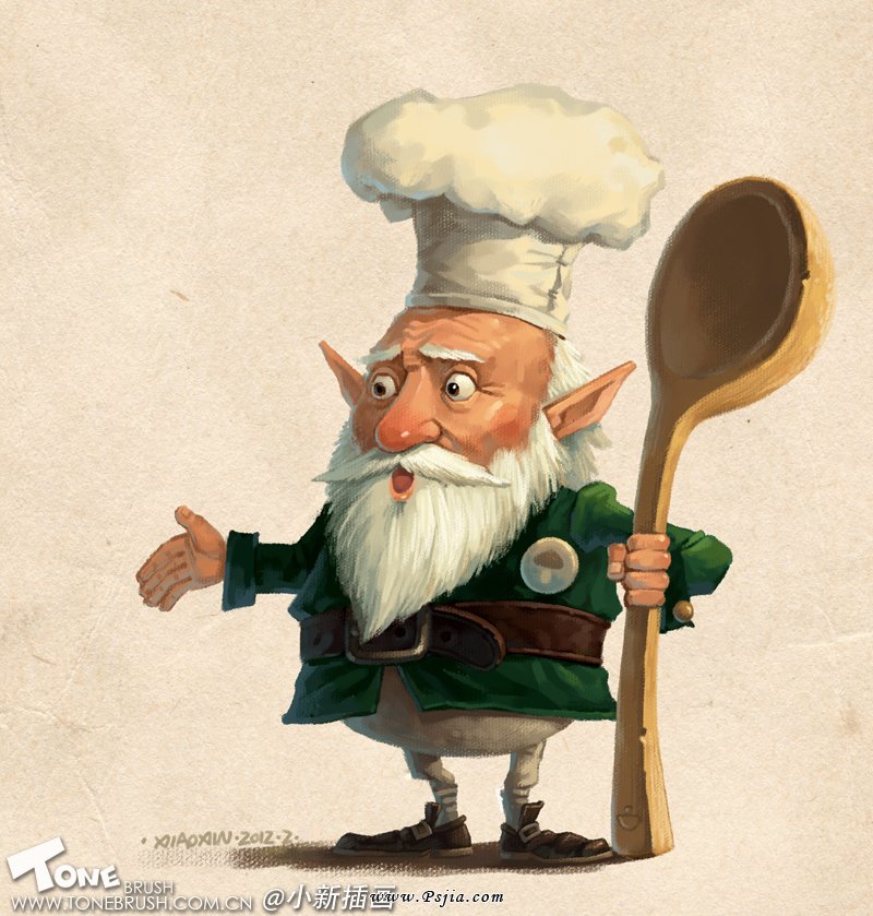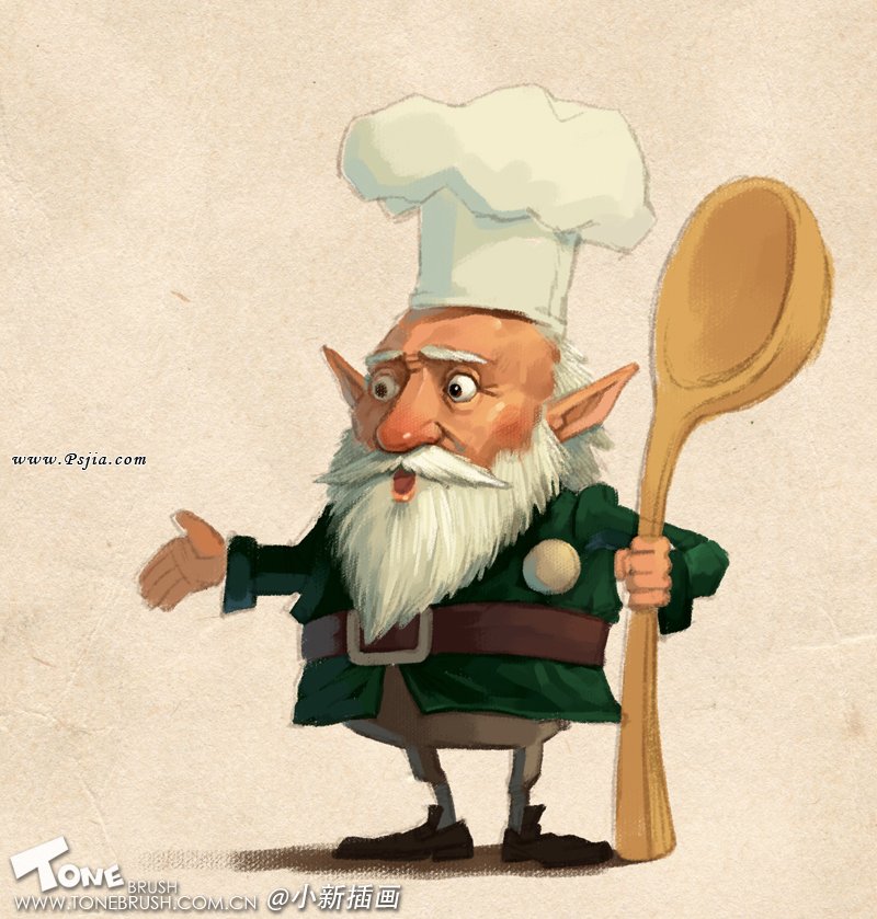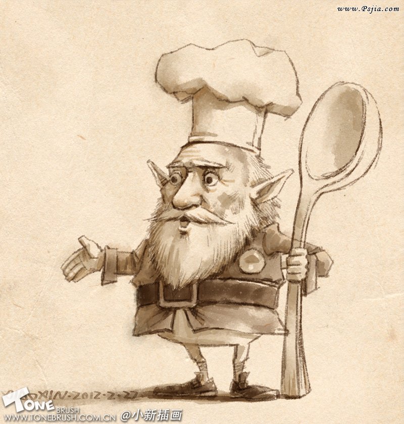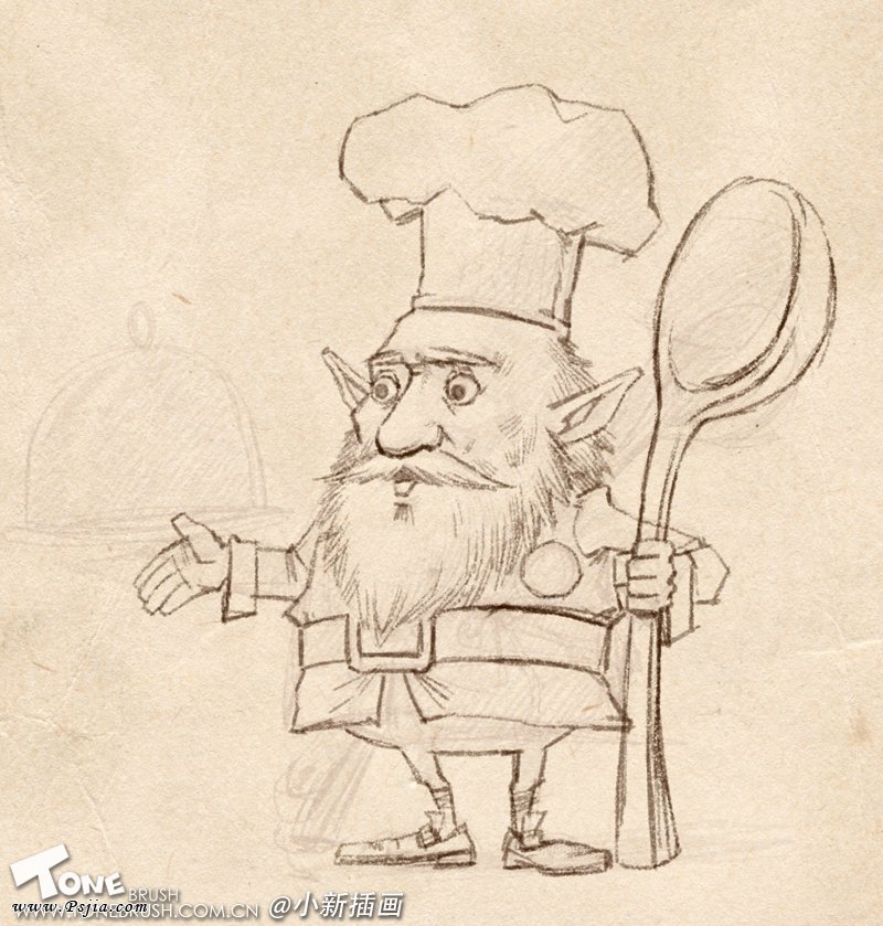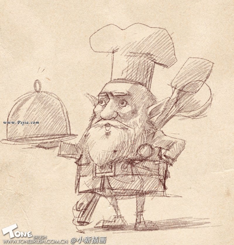 1:在创作的初期我比较喜欢一些随意的涂鸦,这张草图就是我们这个厨师老头的原型了。和最终完成的画稿比较,我们可以看到老头的面部变化比较少,道具上的改变非常的大。在我们深入的创作中,千万不要过分被最初的草图约束才好!