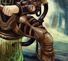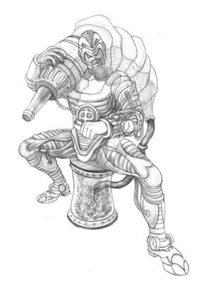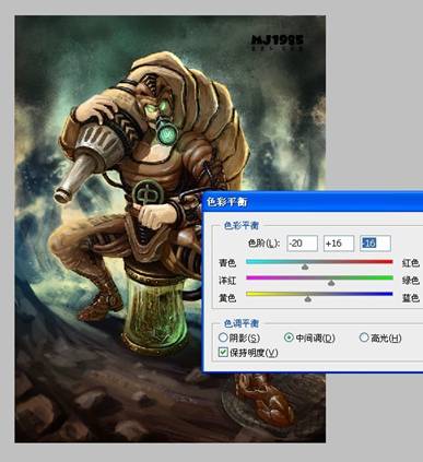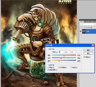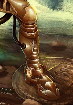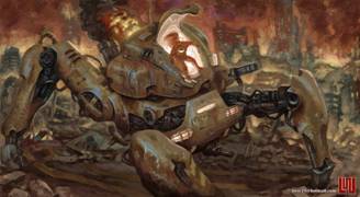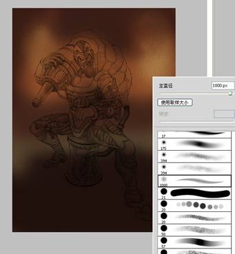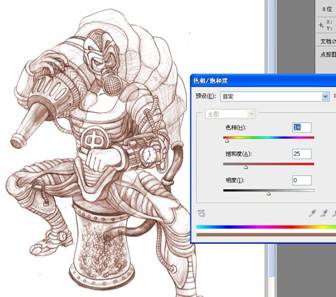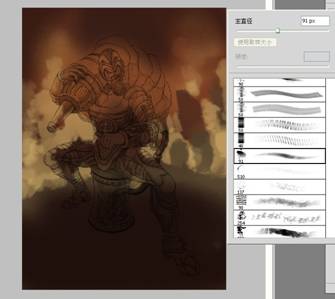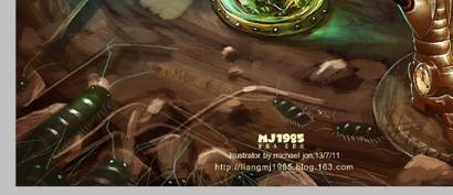 步骤二:创作线稿阶段,经过一系列的资料寻找,大概找到自己想要表达的感觉,随之展开草图创作,完后得出以下的虫师线 稿,我个人比较喜欢用铅笔作线稿,然后扫描到电脑。 步骤三:考虑到作品的调性,我把色相调了一下,以方便后面的创作。 步骤四:一般我在创作前会找好颜色和调子上的参考,这是我这一次的参考。 步骤五:所有的前期工作都准备好了,开始上色,新建一个图层,根据参考,铺大色块。 步骤六:利用网上下载的笔刷,开始创作背景,铺大感觉,这个时候可以大胆点不用考虑细节,画错没关系。 步骤七:转换771号笔刷,这是我用的第二个笔刷,考虑到主体跟背景的对比,绘制背景时,我会运用材质感对比比较大的笔刷,跟主体成对比,拉开前后关系。 步骤八:利用91号笔刷细化背景,这个笔刷我最常用了,后面细化基本就用这个笔刷,所以我基本就用了三个笔刷,其实画画的时候不用纠结笔刷用的多少,一定要为画面服务,不要每个地方都乱用笔刷。 步骤九:此时再新建一个图层,给主体铺大色块,同时确定光源,前期阶段,背景和主体最好分两个图层绘制,方便修改。 步骤十:背景和主体继续深入,尽量多找块面,把关系拉开,把细节先放下。 步骤十一:继续逐步细化主体跟背景。 步骤十二:加入石头和沙井盖营造气氛,等细化差不多的时候,处理一下背景跟主体的关系,这个时候两个图层就发挥到作用了。 步骤十三:大关系基本确定后把所有图层合并,我最喜欢合并了,免得找来找去。 步骤十四:合并后,可以对主体进行细节刻画了。 步骤十五:对主体局部进行细节刻画,这时候得考虑光源对物体的影响了。 步骤十六:整体画得差不多了,但还不够,此时像素会比较低,比较难再深入。 步骤十七:接着,把像素设置增大,继续深化细节,我这里调到4000X5498,机子配置好的可以调更大。 步骤十八:对虫子进行细节刻画。 步骤十九:细化后看整体效果,此时觉得有点脏和灰的感觉,整体过于偏冷,画面一定要尽量多找对比,明暗的对比,冷暖的对比,材质的对比,对比越多画面感越丰富。 步骤二十:画面整体偏冷了,我利用色彩平衡工具,把画面调节到合适的调子,所以说ps是个很强大的工具。 步骤二十一:整体经过调节后比较之前舒服多了,此时发现左下角有点空,于是我加了点虫上去,和画面有个呼应,加上logo点缀画面,作品基本完成。 步骤二十二:灭虫器细节图。 步骤二十三:头部细节图。 步骤二十四:首部和脚部的细节图。