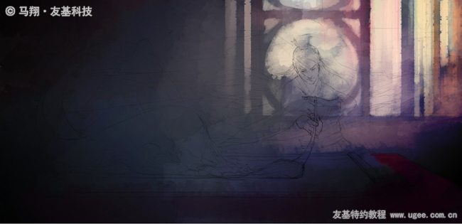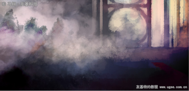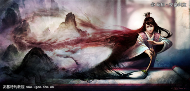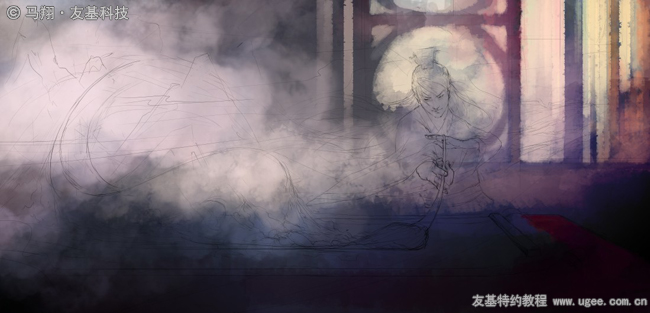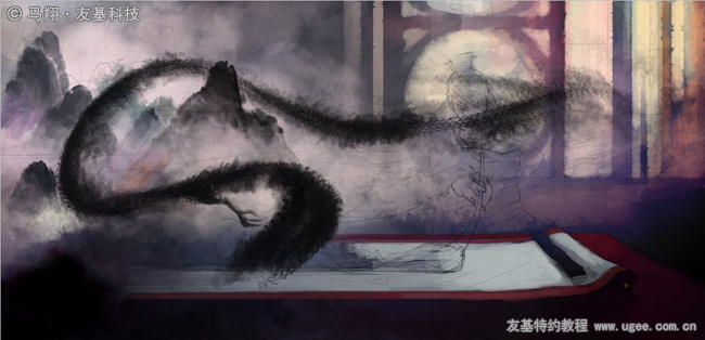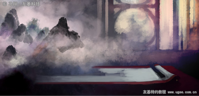 然后丰富一下背景的水墨色彩。我的想法是画面的左边尽量使用水墨效果,右边的人物场景则是比较写实的,虚幻与现实的糅合,我自己也很期待最后的效果。