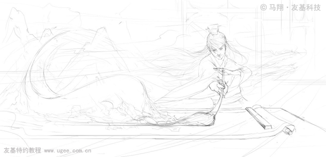 1.一切准备就绪,现在开始释放自己的思维构图吧!首先定好构图,粗略画出线稿部分。