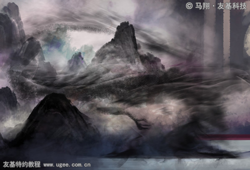 这条龙是从纸上跃然而出的,为了表现速度感,我对龙鬃爪子和接近画笔画纸的部位使用了模糊效果。