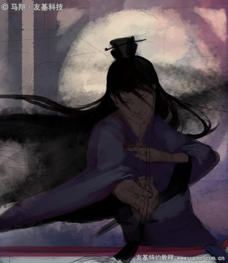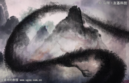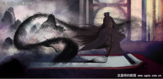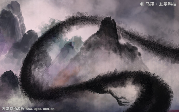 10.人物到这步大概的色彩明暗关系也有了,看整幅画的时候我对这龙很不满意,完全没有墨通透的感觉,动感也不强烈,于是我重新绘制。具体的方法是用大面积的【水墨笔刷】铺底,用【橡皮擦】工具擦出造型,锋利的边缘使得造型比较明确,然后用一个【纹理笔刷】绘制鳞片纹理,注意透明度不要100%,否则不通透。效果如下图所示: