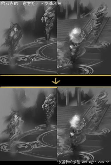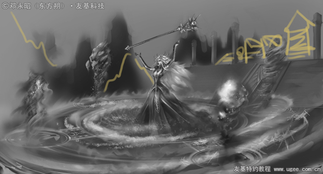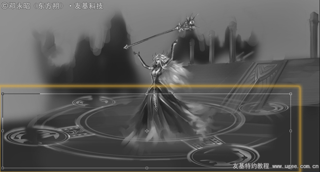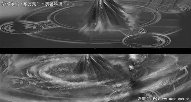 然后把制作好的魔法阵拖曳到画面中适当的位置,【Ctrl+T】选择自由变换工具将魔法阵调整到适当的透视形状。 图10-2 11.接着开始制作四大元素的基本形状