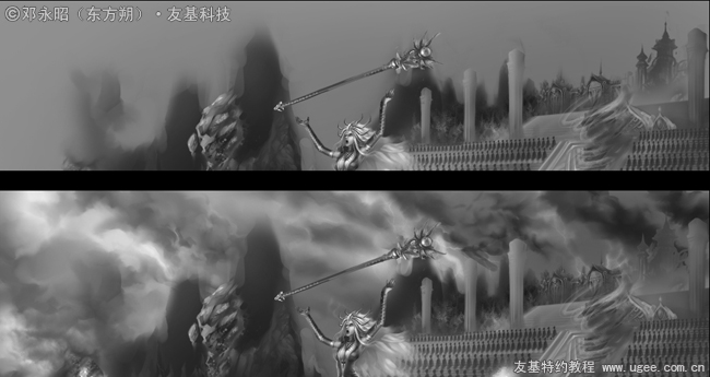 增加了后景的云,整个气氛就出来了。(PS:我在前景的云用的是亮色,越后面就越淡越沉色,这样目的是加重前后明暗关系的对比,拉大色差增加视觉冲击力。)