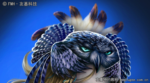 由于光线来自左上角,头饰距光源比较近,故明暗对比会比较强烈。头饰可以看成两部分:第一部分是靠前的头部和翅膀,另一部分是尾翼部分。后者可以适当虚化以衬托出前者,也可强调前者的受光边缘线以弱化后者。