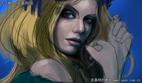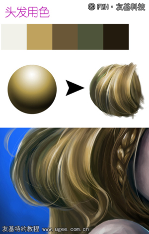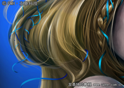 在画发丝的过程中,觉得稍微单调了些,所以加上一个蓝色的发带穿插在发丝中。同样将发带的起伏理解为球体并交代出前后关系,记得要加上发带在头发上留下的投影。