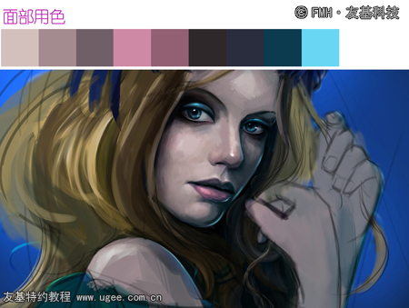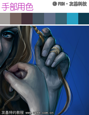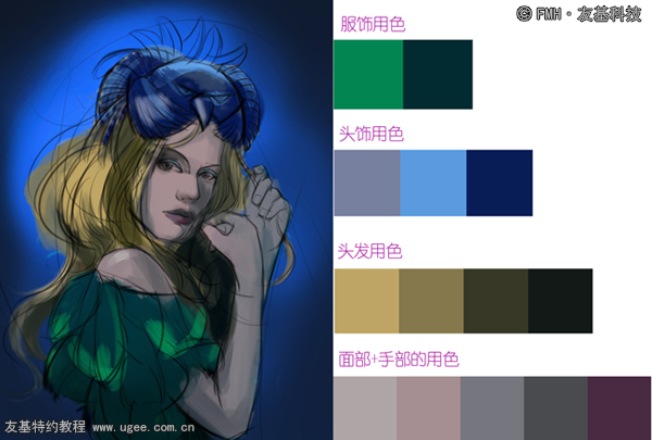 3.新建图层,选用较大的笔刷铺出人物的大体色,同样类似于传统绘画技法。此阶段以大块面大色调为主,区分出头饰、人物、衣着的大面积用色,先忽略细节。由于整幅画面颜色偏暗,故整体的用色会偏灰偏冷,以达到画面基本统一。以下为各个部位铺色时的用色和插画铺色后的大概效果: