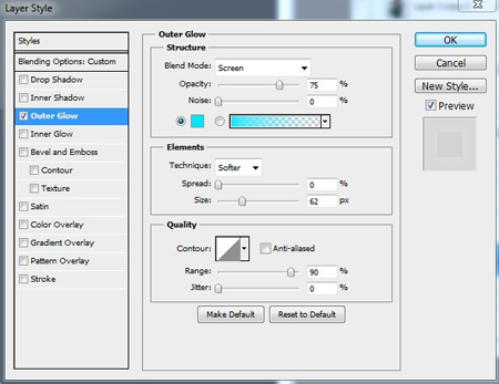 将人物图层的图层样式调节为外发光并为发光图层增添蒙版,使画面中心最亮的部分控制在头部。在背景部分可使用液化工具制作烟雾状图形,形态和方向可随意调节,透明度为25%,这个步骤可凭个人喜好制作,亦可省略。图层样式设置如下图