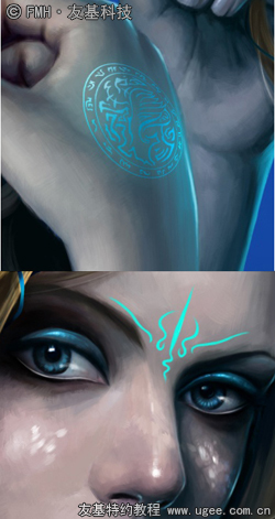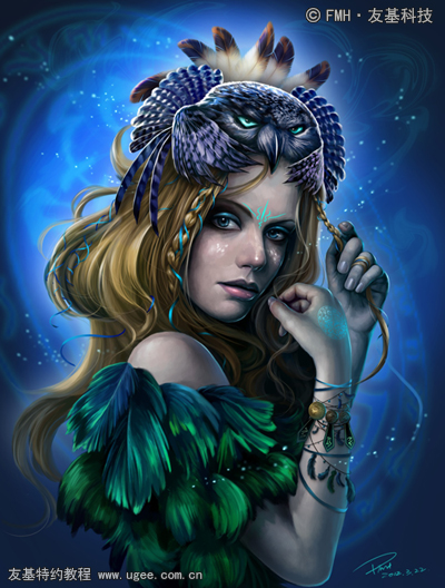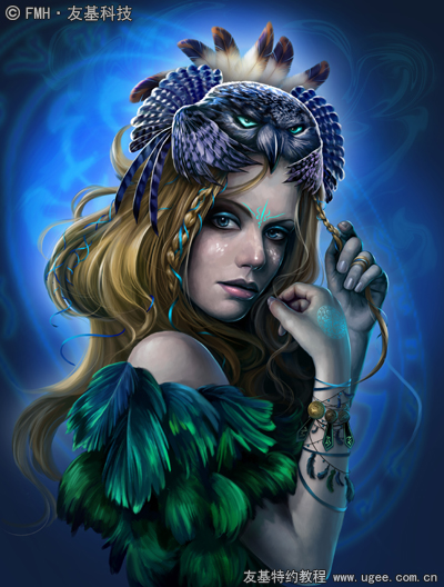 10.整体深入刻画。深入的同时调整整体效果。颧骨处增添羽毛状的妆容,同理,根据人体的结构调节深浅及透视。并在角色的额头以及手臂部分增加蓝色图腾式的符号;