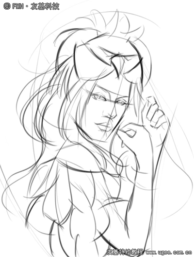 起稿时我习惯尽量用长直线去调整型体,切出块面,类似于传统的纸上绘画。勾勒出角色的主要动态,身上的衣物比较粗略,此时以抓大感觉大块面为主,细节方面的东西可以暂时先不考虑。草稿完成如下图: