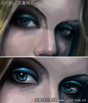 5.人物刻画中,眼睛总起着至关重要的作用。塑造眼睛时可以把眼部理解为一个球体,而眼球则是眼皮包裹下的另一个球体。我给这个角色的眼部刻画成蓝色眼影+烟熏妆+蓝色眼球,想营造出深邃神秘的气氛,同时可以用皮肤【笔刷】给人物的皮肤增加一些质感。