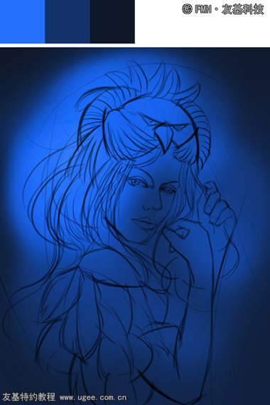 完成图 大家好,这次拿来了一幅充满神秘和蛊惑色彩的《女巫》插图与大家分享绘画过程,此幅画色彩基调定为较深的蓝绿色。女巫金黄色发系,身着羽毛类的服饰与饰物,动态为颔首