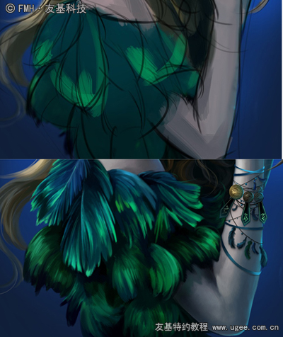 9.刻画服饰与手部饰物。服饰以蓝绿色羽毛类的物质为主,刻画出上下的明暗以及层叠关系,底下部分为防止突兀破坏画面适当的模糊虚化处理。手臂部分太空,加上一些装饰物品,饰物的走向顺应手臂的结构。