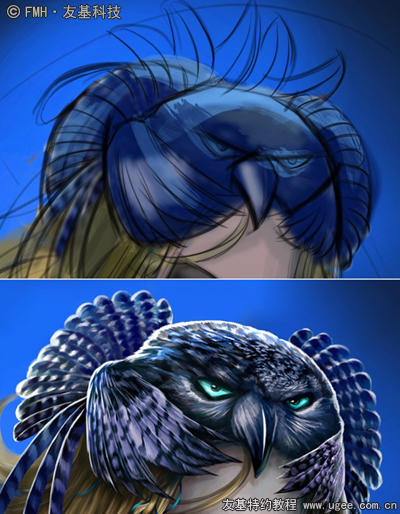 8.刻画头饰。头部的饰物设定为猫头鹰(好吧,其实看着挺蠢的)。笔刷的运用如下图所示:
