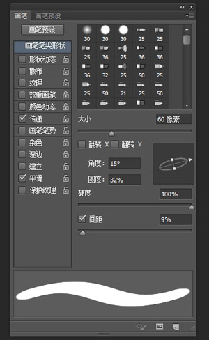 当然,我们还要对画笔做些设置,主要是把【画笔】笔尖形状改成【尖】,【扁形状】。主要考虑的是在绘画过程中绘画面积可以更大些,特别是铺色的时候比较好用。画过油画的同学肯定深有体会油画笔之所以做成扁状就是因为在大块填色的时候方便。