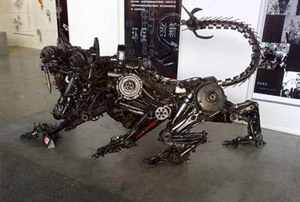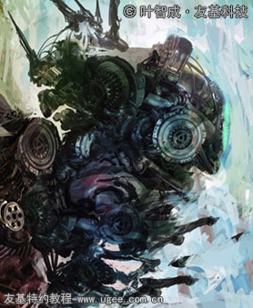 在画这个机器头的时候,只要铺出大关系,然后根据这个形象展开想象,你觉得它像什么就往那个方向画下去,我个人觉得它像一个昆虫的头部,有点像蚂蚁,所以我就朝那个方向走下去,接下来就是素材派上用场了。首先将机械零件剪切到画面。如图下图所示: