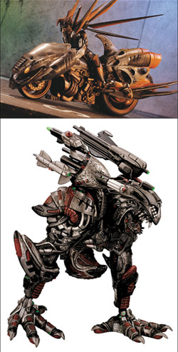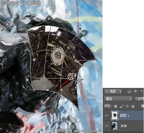 5.在贴好后,我们再回来看看这张图,资料素材为我们节省了许多研究机械结构的时间,我们利用这样的素材快速的表达了我所想要的效果。在这个基础上继续刻画,把机械的构造以及整个昆虫机械飞船的头刻画出来。首先参考一下以下图形:
