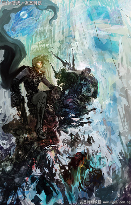 机械元素合成以后就是细节的刻画,同时还是大胆的铺垫后面的背景,我在考虑将后面的西式城堡设计成细长的高耸的空中城堡。并根据铺设的一些画笔留下的印记把它们变成桥,这些桥把城市连接在一起。于是到这个步骤整个画面构图完成,接下来就是设计人物。