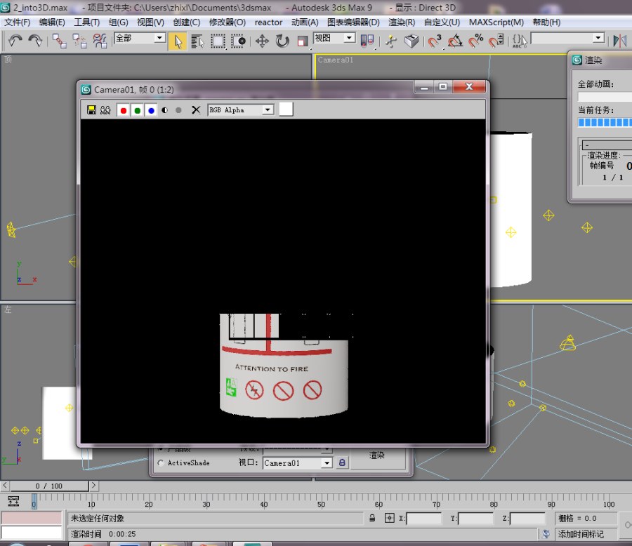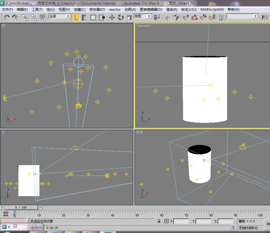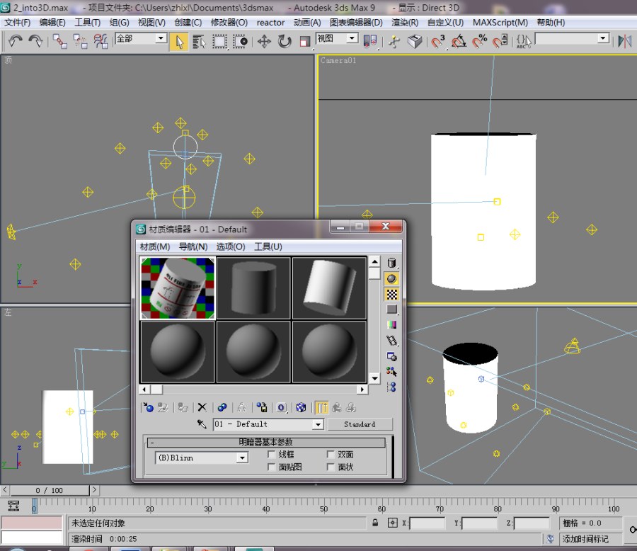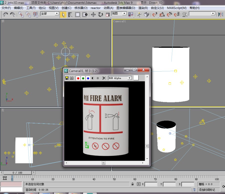 1.打开3ds Max,建立一个比较合乎平行透视的圆柱体,并打光:,设置摄影机毫米数设成45°