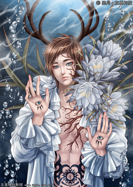 潋滟波光之中一水之隔与观者四目相对的白衣少年,为这个炎夏带来阵阵清凉冰爽感受。美少年身上的丝绸要强调反光效果才好看,而花朵的绘制很需要耐心和细心,另外周围的小气泡也不能缺少哦。下面我们就接着为大家介绍详细的画法吧。