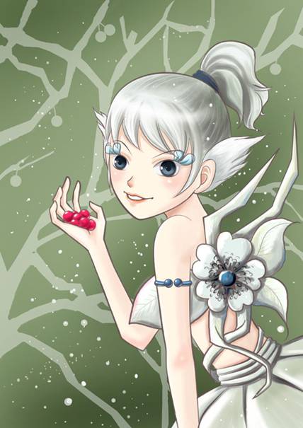 步骤8:找一个树枝剪影的图案加以修改。放在底色的前面,并调整它的透明度,使它不要抢了精灵的风头。这时发现淡灰的底色不是很漂亮,那我们就换成绿色吧!但人物也稍显偏灰,那我们就调整一下,我在头发的图层对头发的暗部加深了一下。花朵的图层也进行了明暗的调整。最后在绿色底色的局部做了加深的处理,使它有点空间感。这就是分层的好处,调整自如。最后在画面上随便点了一些小小的白点来烘托气氛。好了,可爱的丛林精灵就这样诞生了。