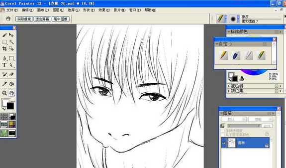 工具:PAINTER + 友基绘影II PF8080 数位板 1、新建图层用覆盖铅笔打出草稿。这里你就会感觉出绘影2数位板细腻压感所带来的好处。个人喜欢用覆盖铅笔,感觉比2B用着更舒服些。 图1 2、