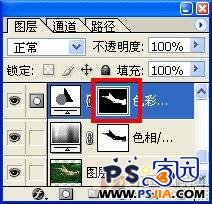 2.在"色相/饱和度"调整图层旁的蒙板中用柔一点的黑色画笔涂抹或用套索工具选取后羽化填充黑色.