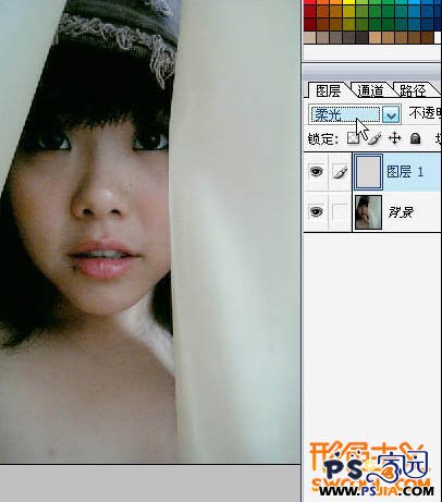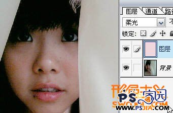2、合并所有图层,新建一个图层填充颜色:#F0D7DD,图层混合模式改为“柔光”,来微调人物肤色。