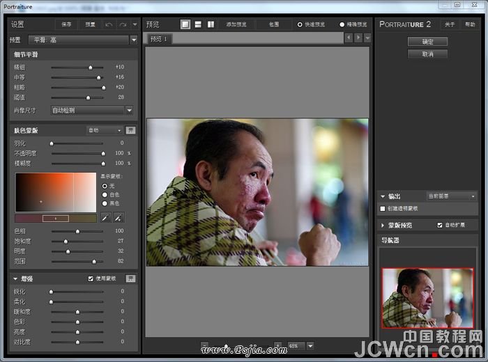 2、用插件磨皮:这一步很重要,直接影响最终效果。我这里使用的是Portraiture滤镜, 设置为“平滑 高”。磨光一些,不要担心纹理。