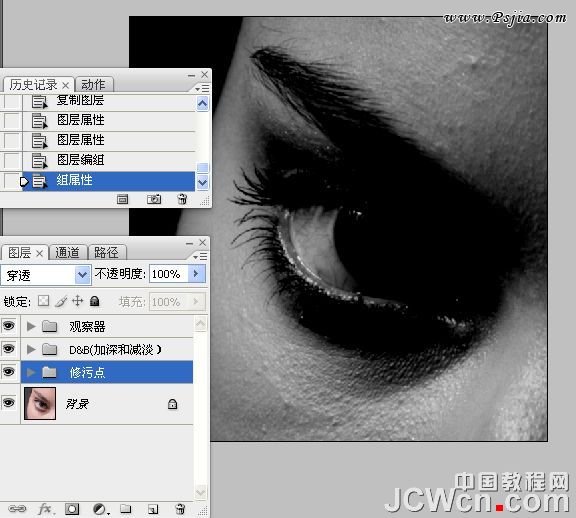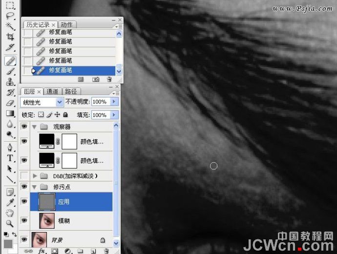 12、关闭“观察器图层”眼睛,使用“修复画笔工具”对眼睛粉刺和皮肤进行处理。