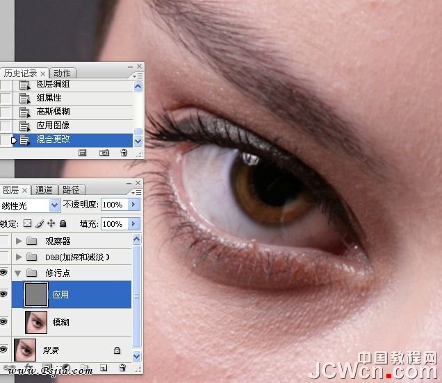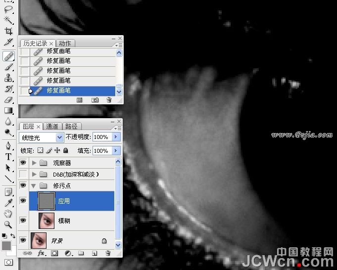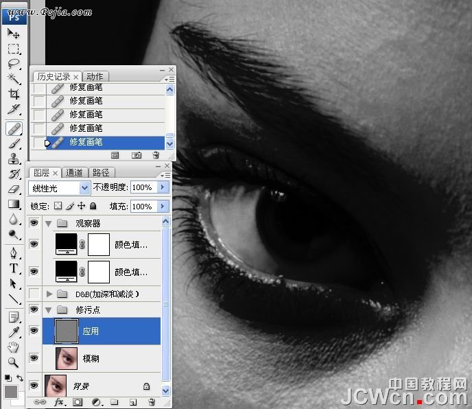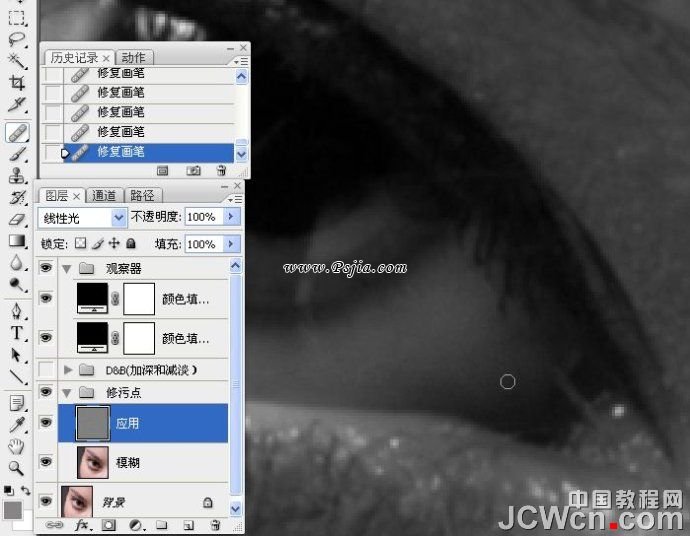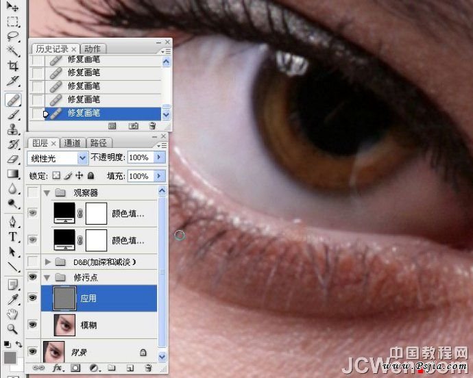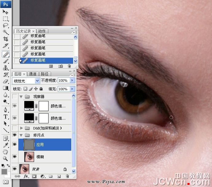 9、选中应用图层,使用“修复画笔工具”处理眼白的血丝。