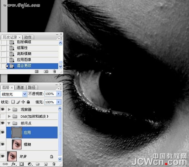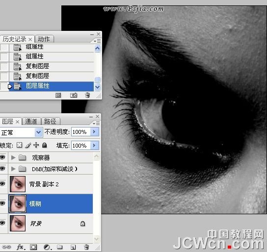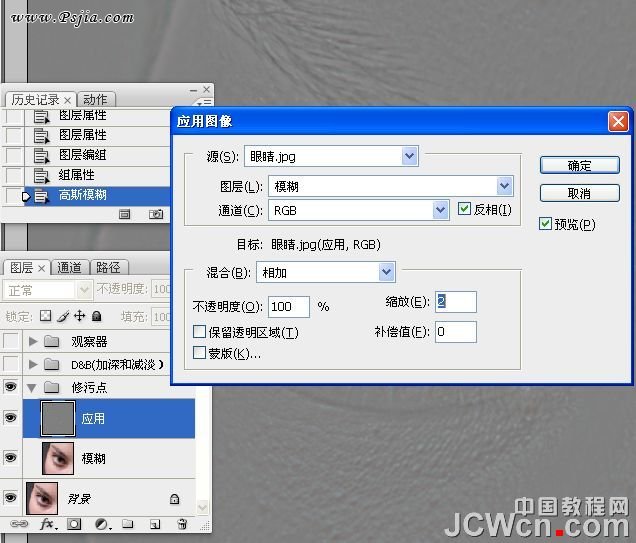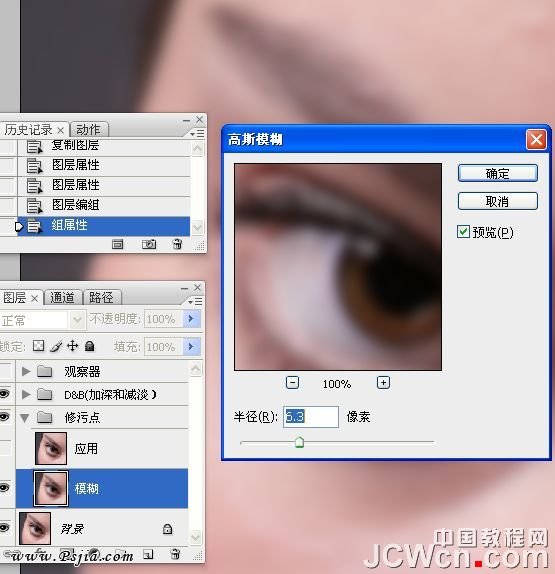 二、修污点 1、复制背景图层(两层) 2、分别命名为模糊和应用 3、编组和命名为修污点。 4、关闭观察器图层的眼睛。 5、选中模糊图层,执行高斯模糊