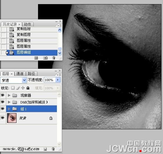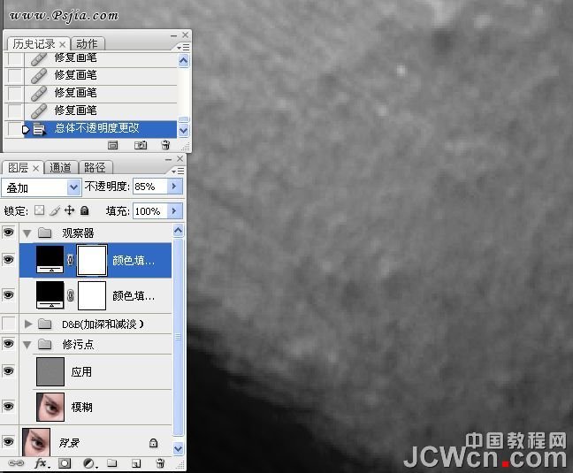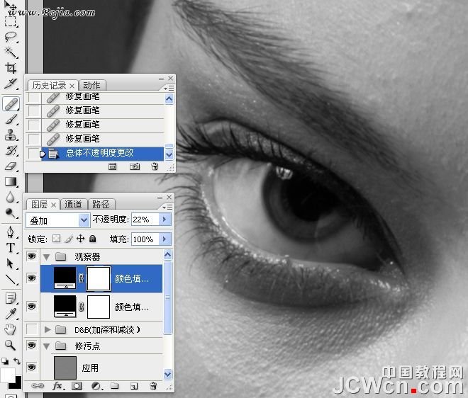 10、降低观察器图层的不透明度,选中应图层,使用“修复画笔工具”对右眼白进行处理。
