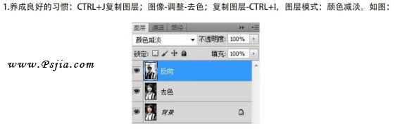 1、打开原图素材,养成良好的习惯,按Ctrl + J把背景图层复制一层。按Ctrl + Shift + U 去色。把去色后的图层复制一层,按Ctrl + I 反相,图层混合模式改为“颜色减淡”。