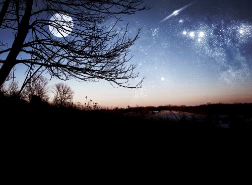 夜景图片不仅仅是把图片的颜色调暗,需要根据素材图片的色调构成选择好视觉中心,然后在天空部分加上一些星光及月色等。后期再适当渲染一下颜色和细节即可。
