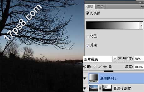 6、添加渐变映射调整层,图层模式正片叠底,不透明度78%。