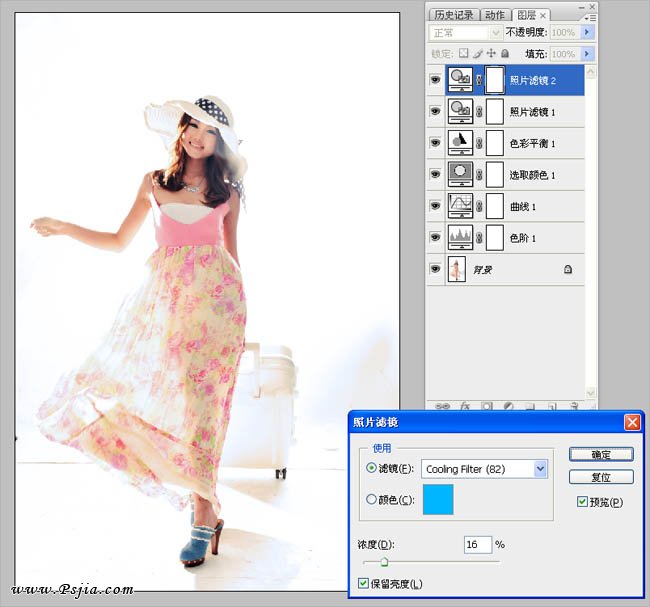 4、然后使用色彩平衡来调整皮肤高光的颜色使背景与人物的色调统一为暖色调。 5、使用照片滤镜工具让照片整体色调统一,偏暖调。 6、然后在叠加一个