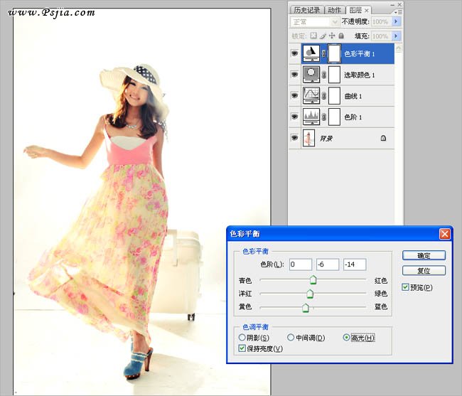 4、然后使用色彩平衡来调整皮肤高光的颜色使背景与人物的色调统一为暖色调。