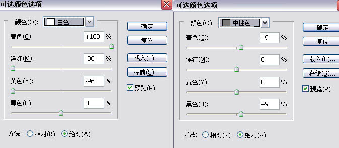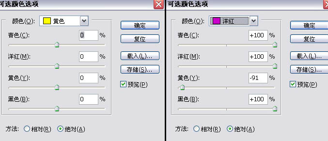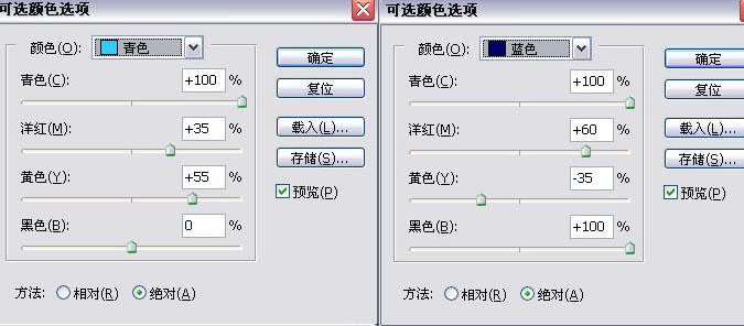 | 9、新建色相/饱和度调整图层,数值如下:全图:0/29/0;红色:35/15/0;黄色:0/100/0;绿色:0/100/0;青色:-5/10/0;蓝色:25/-45/ 0;洋红:0/-35/30。 10、新建亮度/对比度调整图层,数值:亮度:10 对比度:6。 11、进入通道面板,CTRL+点击绿色通道载入选区,反选(CTRL+SHIFT+I),然后新建可选颜色调整图层,(技巧创建时按着ALT新建,会弹出对话框,然后勾选:使用前一图层创建剪贴蒙版) 12、新建可选颜色调整图层,参数如图: |
