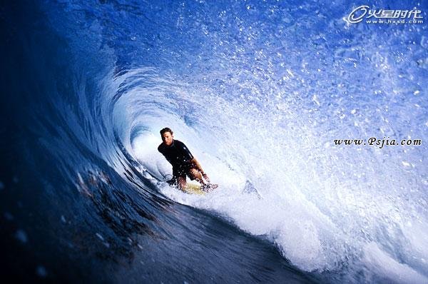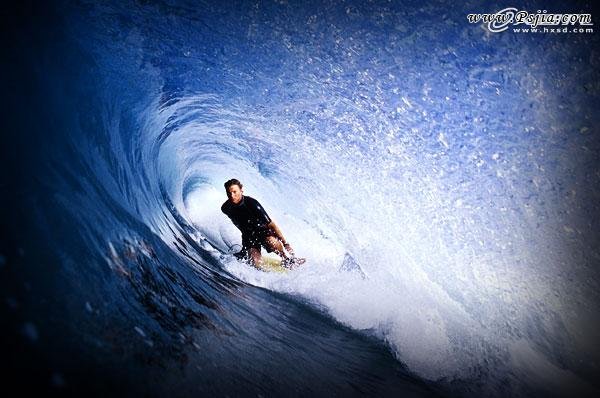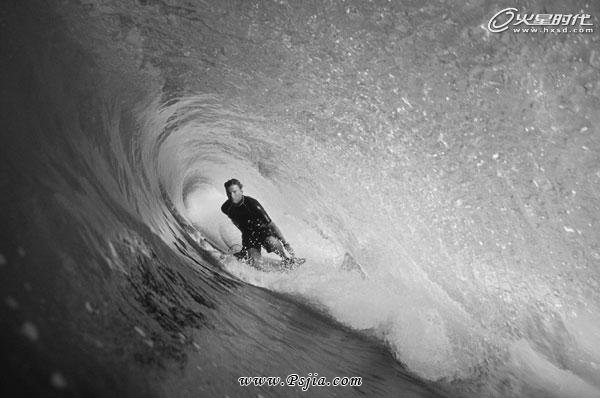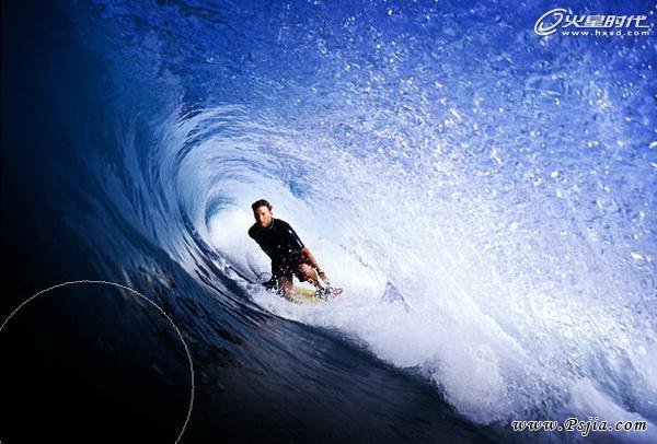 还是使用这个方法来调整一些细节。在这张冲浪照片中,左下角的位置存在着一些杂点,好像是水泡或者是波浪或者是其它的什么东西,这不重要,我们可以去掉这些杂点。所以使用一个大的黑笔刷,然后在左下角位置轻轻地涂刷。这样照片中的一些地方过渡的就很自然,看上去非常的干净,而一些地方就会更加的引人注意,同时这也增加了照片的视觉冲击力。(图06)