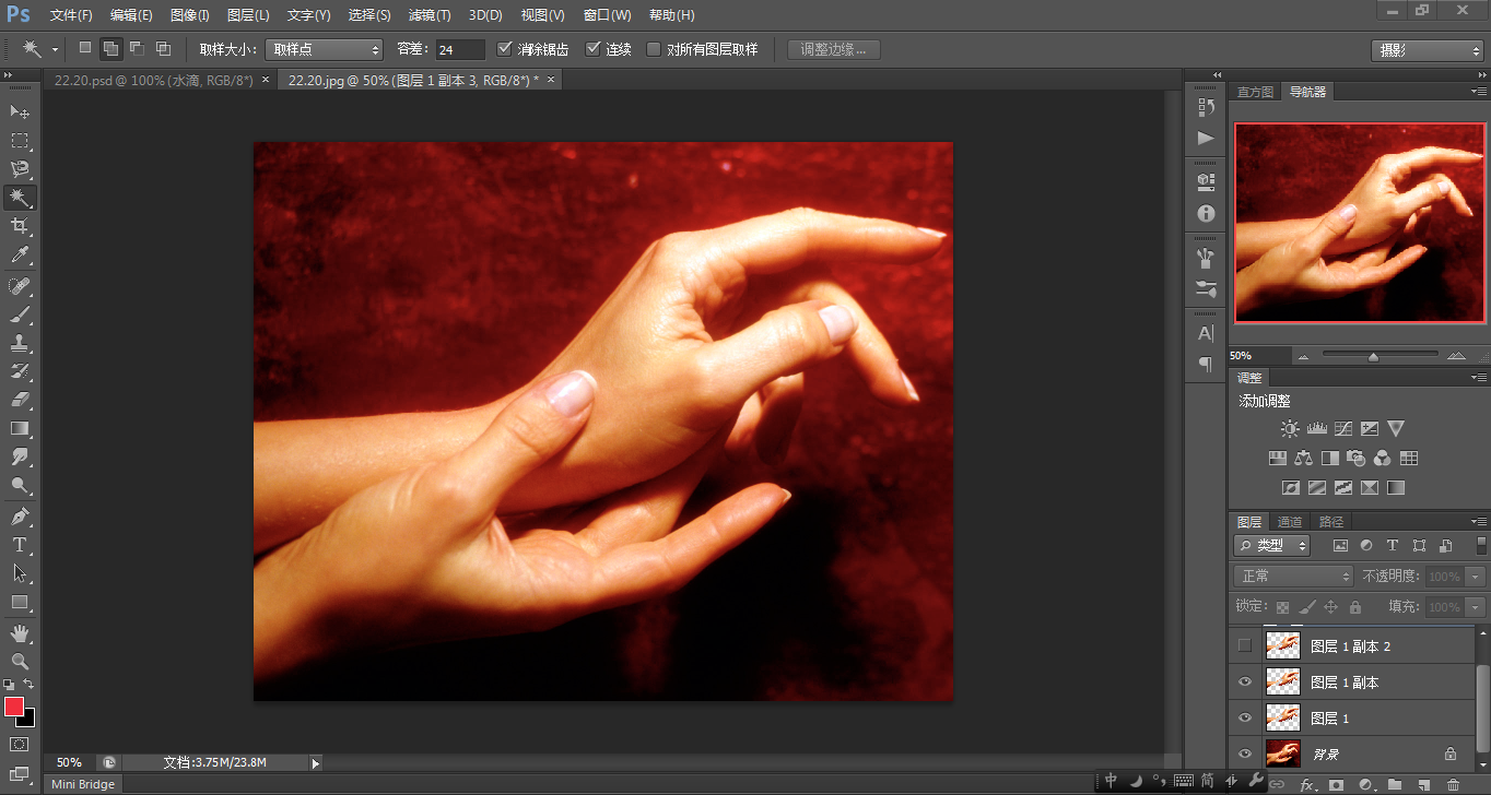 载入路径中的选区,将选区内的图像复制到四个新的图层,选择图层1和图层1副本,将其他两个隐藏